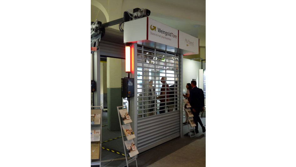 von 32: Junge, vom Bundeswirtschaftsministerium prämierte innovative Unternehmen haben sich auf einem Ministand in der Festhalle präsentiert. Eigentlich nur ein Unternehmen. Zu sehen gab es Weingold Tore, Doors to run your business. Also, ein Vertikales Schnelllauftor. info@weingold-tore.de.