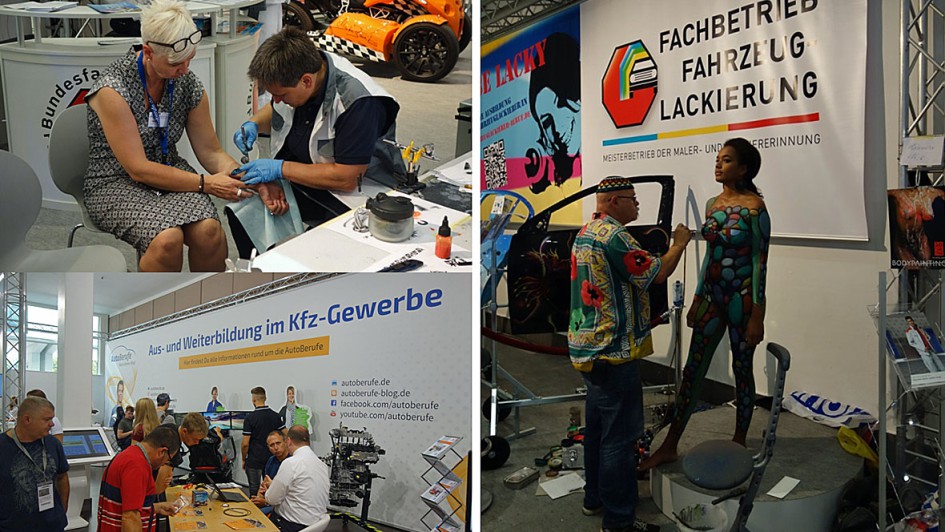 von 32: Ein weiterer ZDK-Stand galt der Nachwuchswerbung und der Weiterbildung. Auf dem gegenüberliegenden Stand der Fahrzeuglackierer ließ sich Birgit Behrens, im ZDK für den Bereich Personal verantwortlich und neulich von der "Automobilwoche" als eine der Top-50-Powerfrauen der Automobilwirtschaft ausgezeichnet, farbig "lackieren". Motto: Be Lacky!