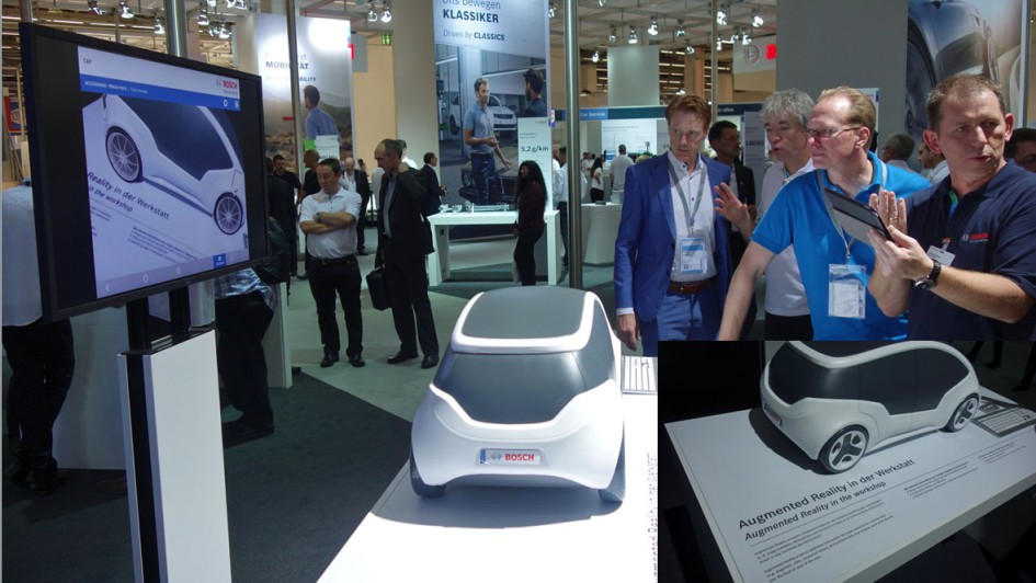 von 32: Doppelsprachig: Deutsch - englisch! Augmented Reality heißt dann auf Deutsch: Alle relevanten Informationen auf einen Blick! Es geht um die Vernetzung verschiedener Werkstattgeräte und deren Daten miteinander. Bündelung der jeweils aktuellen Information für den Mechatroniker auf einen Blick. Reparaturanweisungen, Schaltpläne etc.