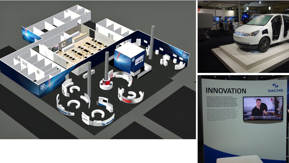von 32: ZF war mit mehreren Ständen übers Gelände verteilt. Und es ging nicht nur um Getriebe und Getriebeöl, sondern um die integrierten Marken Lemförder, Sachs (Drehmomentwandler), TRW, Boge und openmatics. Die Abbildung zeigt u.a. das Grundkonzept des Hauptstandes. ZF-Dimensionen! Was Friedrichshafen und Schweinfurt inzwischen alles möglich machen.