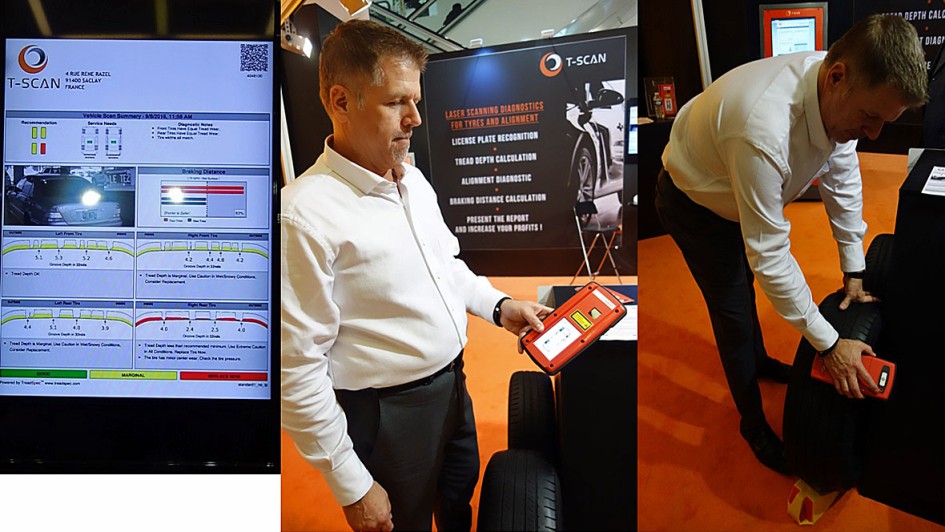 von 32: Mark Tracy von T-Scan präsentierte den mobilen Reifen-Diagnostik-Scan. Man fährt mit dem "Scan" über den einzelnen Reifen und erhält ein Summary über die Profiltiefe von jedem Reifen. Ebenso über den Zustand des Reifens. Die Ergebnisse werden an einem Bildschirm angezeigt und können als Protokoll ausgedruckt werden. Details unter www.tscan-tyres.com. Das Gerät kostet 800 Euro. Monatliche Leasingrate 120 Euro. Daran wird man vermutlich noch etwas feilen müssen.