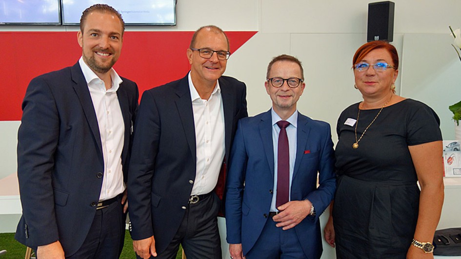 von 32: Prof. Stefan Reindl (IfA) präsentierte auf der Messe beim TÜV Nord Mobilität seine neueste Marktstudie Schadenmanagement 2016. Sie kann für 59 Euro über den Springer Automotive Shop bezogen werden. Hier bei seinem Besuch auf dem Stand von AUTOHAUS mit Patrick Neumann (l.), stellv. Chefredakteur, Ralph Meunzel, Chefredakteur, Prof. Stefan Reindl, Dekan der Hochschule für Automobilwirtschaft Geislingen, und Sanja Klöppel, Anzeigenverkauf.