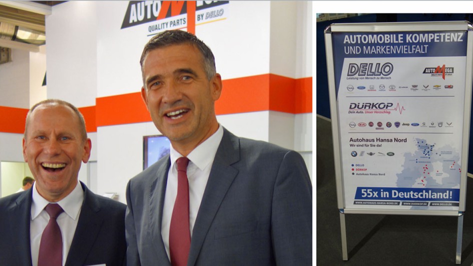 von 32: Björn Böttcher, Gesamtleiter Service und Teile im Hause Dello (r.), und Peter Schamke, Vertriebsleiter Teile & Zubehör, vertraten mit ihrem Stand die Teilemarke "Auto Mega" aus dem Hause Dello, Hamburg.