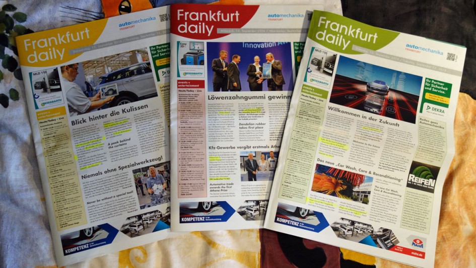von 32: Die Messe publizierte für jeden Messetag die "Frankfurt daily". Man ist Tag für Tag gespannt, was es jeweils an neuen Messenachrichten, Highlights, Erkenntnissen, Vorführungen, Innovationen gibt. Man möchte schließlich Neues entdecken, was man selbst übersehen hat. In den ersten drei Tagen, sprich in den ersten drei Ausgaben waren jedoch zu 90 Prozent die gleichen Inhalte auszumachen. Offensichtlich rechnet man damit, dass der klassische Besucher sich nur einen Tag auf der Messe aufhält.