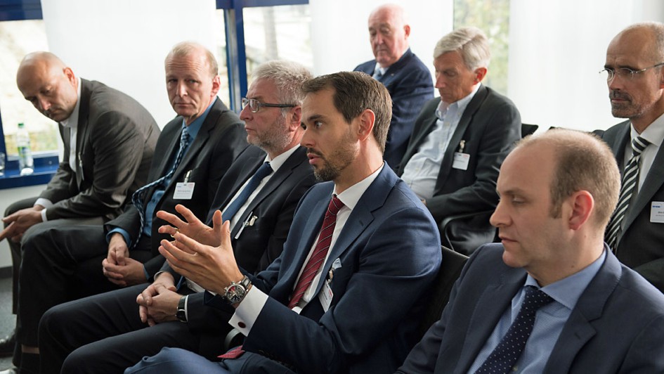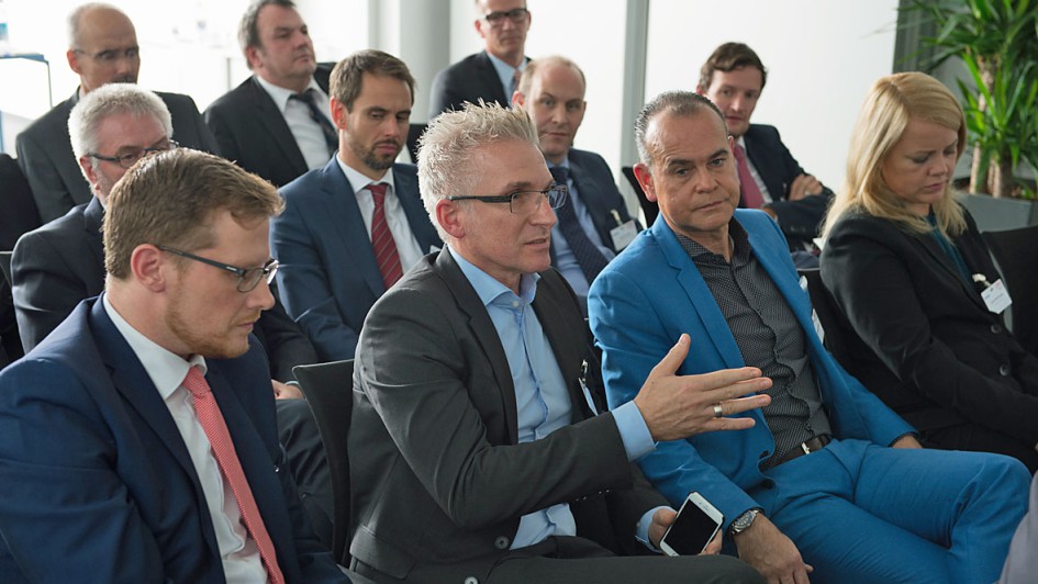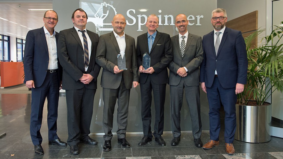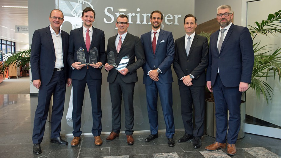 von 11: Den Sieg bei den "deutschen Volumenfabrikaten" und "deutschen Premiumfabrikaten" holte die Volkswagen Autoversicherung für die Marken VW und Audi. Meunzel (l.) und Tenbrock (r.) überreichten die Pokale an Ulrich Bollmann, Armin Hofer, Jörg Hipp und Marc Henry (v.l.)