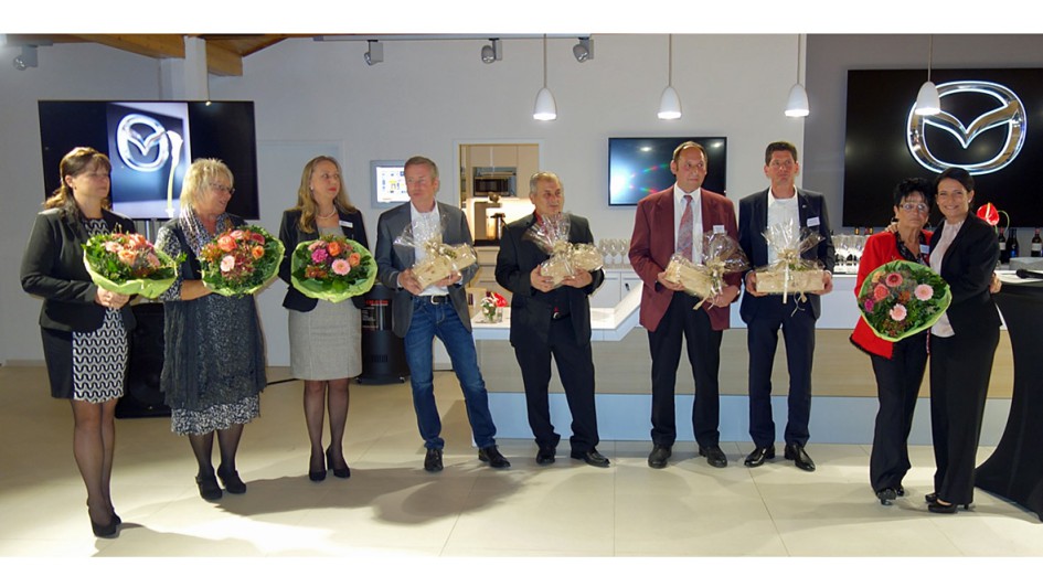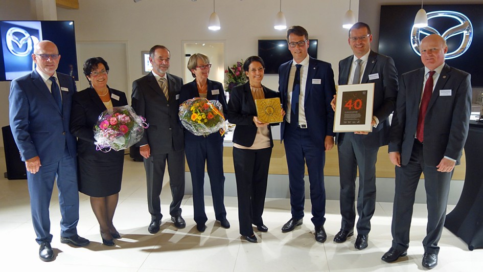 von 14: Als Jubiläumsgeschenk überreichte Bernd Kaplan symbolisch die "japanische Sonne" sowie eine Jubiläumsurkunde, nebst Blumenpräsent. Hier im Bild die zwei Generationen Saurer, li. Hans Saurer mit Frau Maryam, Bruder Michael mit Frau, Aylin Saurer, Mazda-Deutschland-Chef Bernd Kaplan, Regionalleiter Enrico Steppohn und Distriktleiter Andreas Rittler