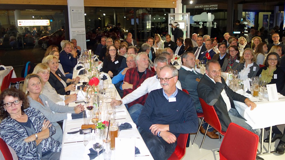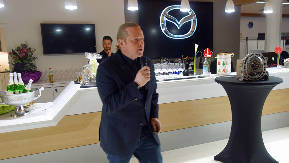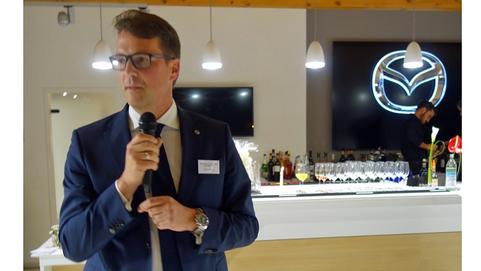 von 14: Als Tischnachbar konnte ich mich mit ihm, Bernhard Kaplan, Deutschlandchef von Mazda länger unterhalten. Und er hatte bereits volles Programm in der Woche hinter sich, u.a. "Goldenes Lenkrad" in Berlin und musste auch am nächsten Morgen früh weiter. Kaplan: "Schauen sie, wenn jemand wie Frau Saurer mit 29 Jahren eine derartige Verantwortung übernimmt, wirklich Mut beweist, dann kann ich nur den Hut ziehen. Wir haben eben eine sehr gute Händlertagung hinter uns. Und dieser familiäre Geist freut uns." Kaplan machte ebenso deutlich, dass er am Mazda-Juniorenprogramm unverändert festhalten wird. Aylin Saurer war einst Mitglied. Und die Gruppe von damals trifft sich heute, wenn auch in verstärkter Zusammensetzung immer noch. Den Kunden zugewandt sagte Kaplan: "Drei Generationen Mazda Saurer, es ist die Marke Saurer, die sie über diese Zeit regional vor Ort aufgebaut haben und dies in Kombination mit der Marke Mazda. Sie leben vor Ort jeden Tag diese Symbiose dieser beiden Marken. Und darauf dürfen sie stolz sein. Und wir sind es auch!"