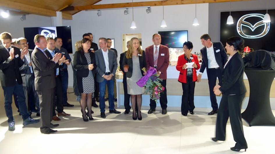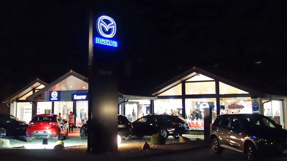 von 14: Ein großartiges Ambiente, das den Gästen bei Ankunft zur abendlicher Feier in Neufahrn bei Mazda-Saurer entgegenstrahlte. Zum Firmenjubiläum wurde auch das Innenleben mit der neuen Mazda-CI gestaltet. Ein großartiger, erster Eindruck. Und auf den kommt es oft an!