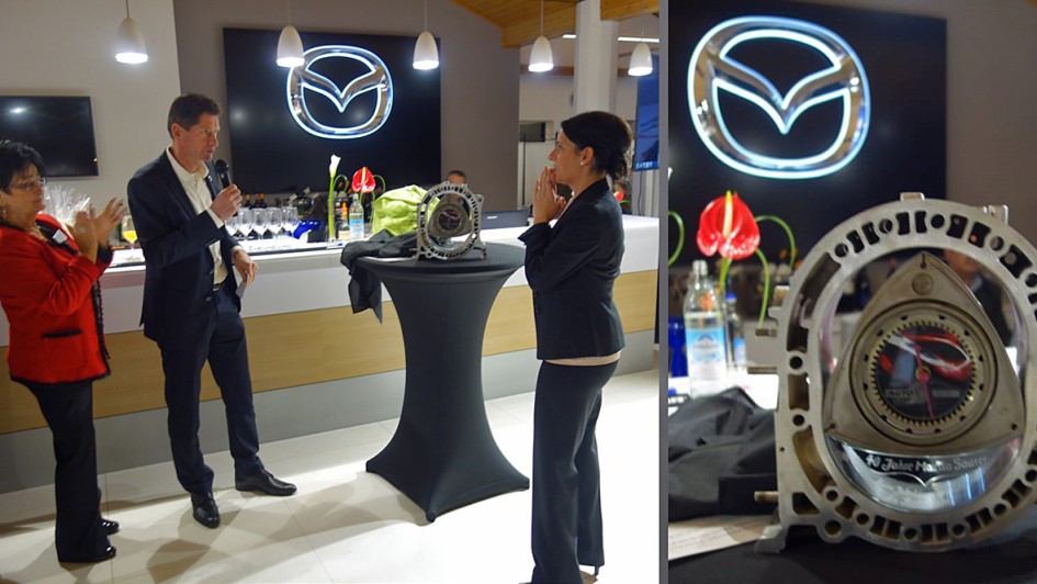 von 14: Den Hammer schoss Christian Kreuzpointer ab. Das Service-Phänomen des Hauses. Und das seit 29 Jahren. Service-Techniker. Mazda war ja lange der Hersteller, der – entgegen denen in Neckarsulm - dem Wankelmotor huldigte. In einen Teil des Gehäuses bastelte er zum Jubiläum für die Chefin eine Uhr hinein. Da kann man nur sagen: "Wem die Stunde schlägt!" Das ganze Sauerer-Team hat an diesem Abend auch seinen Kunden gezeigt, was Team-Geist, Harmonie und das gemeinsame Wollen um den Kunden im Verbund mit einer starken Trainerin ausmacht! Ganz hohe Klasse!