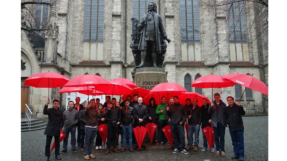 von 24: WWA weiß immer wieder besondere Impulse zu setzen. Auch Kultur-Impulse. Dazu gehörte ein Besuch beim Größten der Großen, dem genialsten Kompositeur: Johann Sebastian Bach, Thomas-Kirche Leipzig. Es sollte regnen. Kein Problem. AUTOLAND-Schirme machen alles möglich. Identity – in rot!