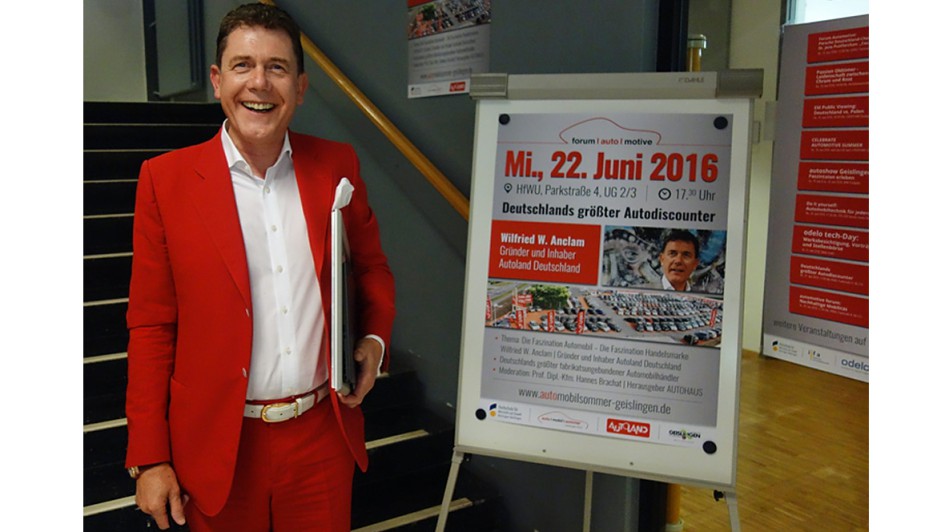 von 24: Vom 11 bis 13. April 2013 lud Wilfried Wilhelm Anclam das Abschluss-Semester der Hochschule für Automobilwirtschaft in Geislingen zu einer Exkursion nach Leipzig ein. Selbstredend, dass er sämtliche Kosten übernahm, vom Bus bis zur Übernachtung im Westin-Hotel. Für jeden Studenten bzw. Studentin. Mit Gastgeschenk auf dem Hotelzimmer, einem Schlüsselbund mit eingraviertem Namen. Am Standort von AUTOLAND in Leipzig erläuterte er die Standortphilosophie. Schlichte Verkaufsräume, aber mit Blumen geziert. Da sieht man rundherum kein Grashalm auf dem Boden wachsen, keine Kippen, keine Papierschnitzel. Ordnung pur! Alle Mitarbeiter in „Firmenkleidung“ und Namensschild gekleidet. Geöffnete Motorhauben strahlen Lebendigkeit aus. "Verkaufen, verkaufen, verkaufen", so lautet seine Losung. Voraussetzung dafür ist eine gute Verkaufsatmosphäre.