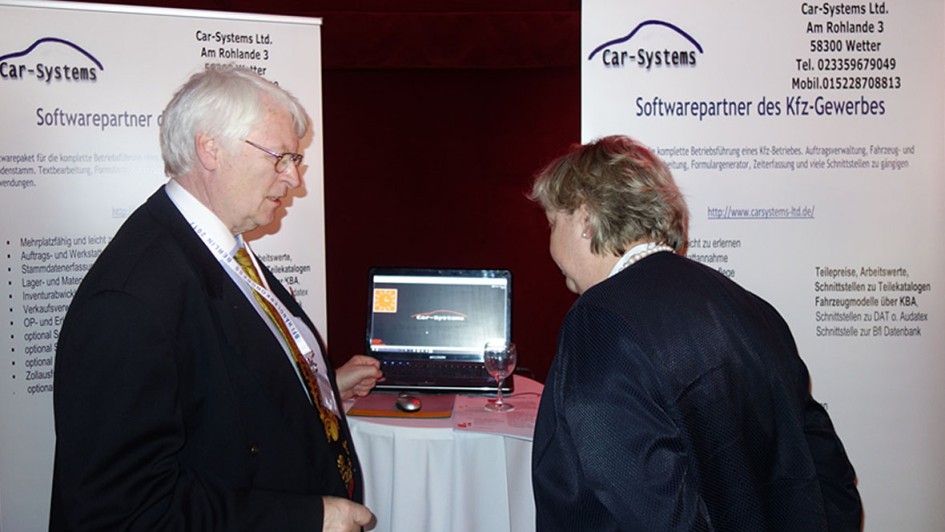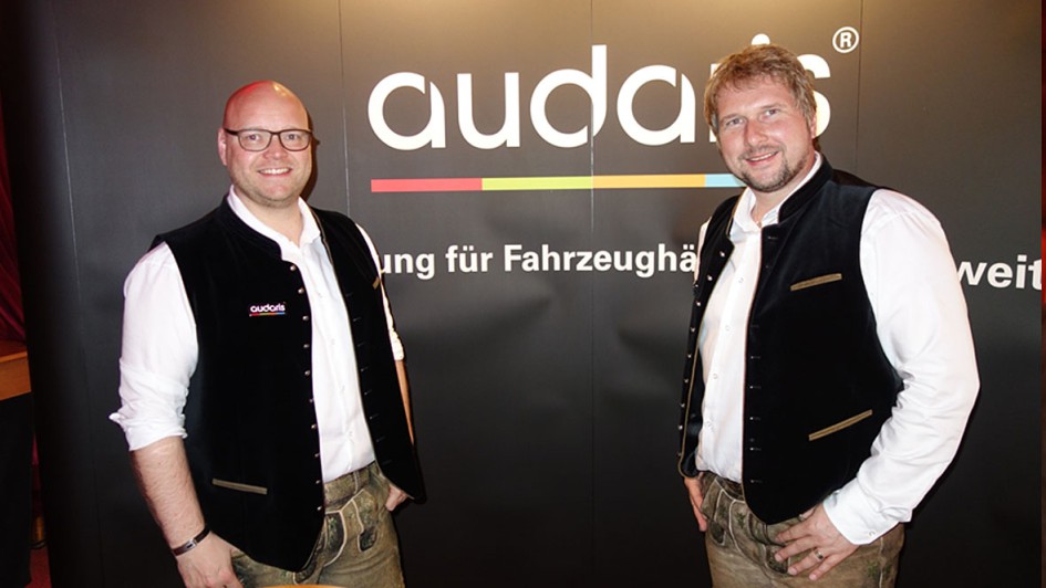 von 27: Jürgen Hundshammer, (r.) Geschäftsführer von audaris GmbH, Neutraubling stellte sowohl im Plenum als auch auf seinem Stand die Cloud-Lösung seines Hauses vor, die in über 300 Kfz-Betrieben installiert ist. Hier mit seinem bayerischen Trachtenkollegen Dominic Rauscher, verantwortlich für Vertrieb und Produktentwicklung