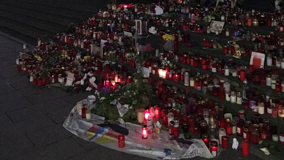 von 27: Spät in der Nacht führte uns unser Heimweg an der Kaiser-Wilhelm-Gedächtniskirche vorbei. Wir gedachten der zwölf Opfer und aller Verletzten des Terroranschlages auf dem Berliner Weihnachtsmarkt am 19. Dezember 2016. Da hat einer als "Soldat des Islamischen Staates" gehandelt. Einer meinte: "Nicht nur als freie Händler lehnen wir jeglichen Extremismus ab. Das erste Gebot jeglicher Religion ist Friede und damit Liebe."