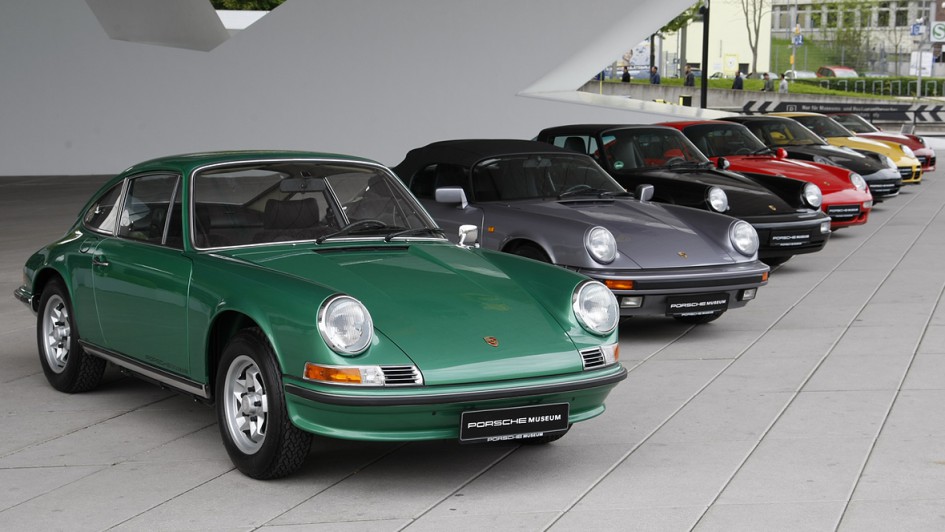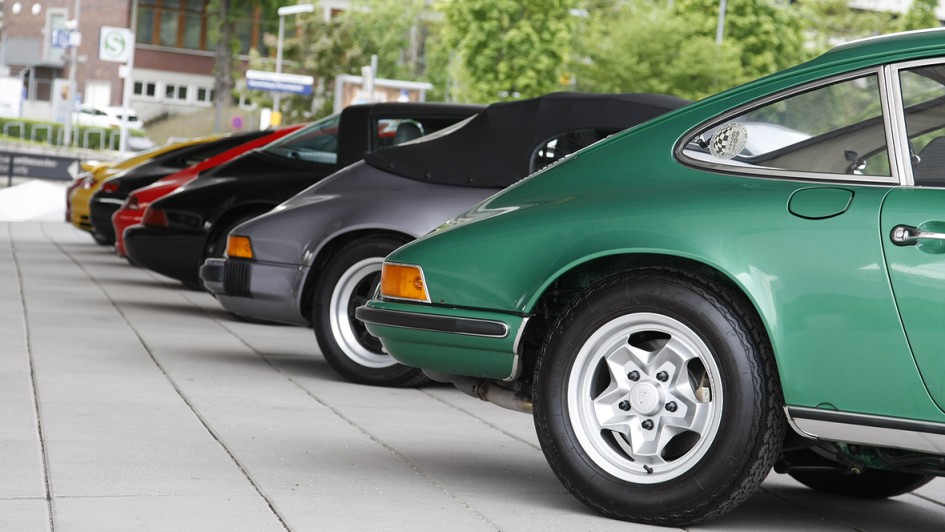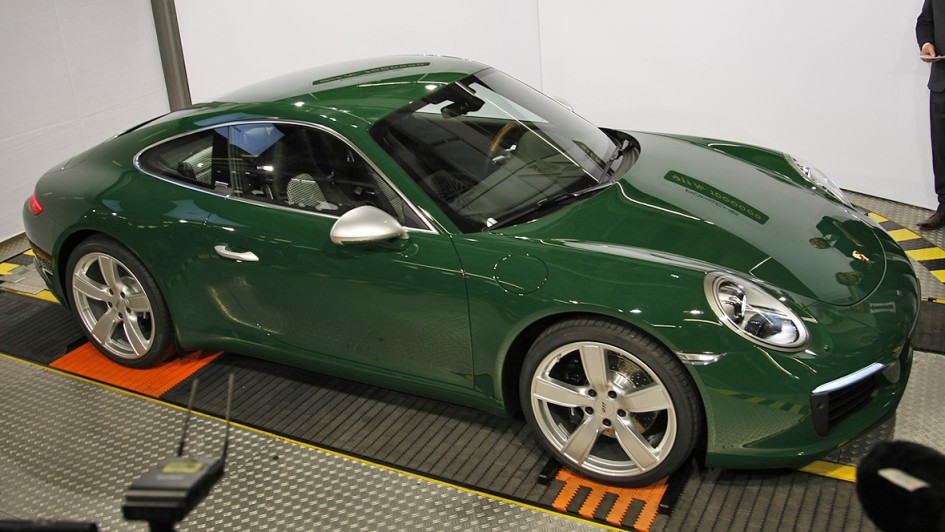 von 5: Es handelt sich um einen in Irisch-Grün lackierter Carrera S als Handschalter, mit dem Logo von 1964 auf der Haube, vergoldetem Porsche-Schriftzug am Heck und klassischen Pepita-Sitzen.