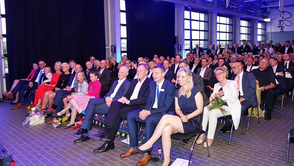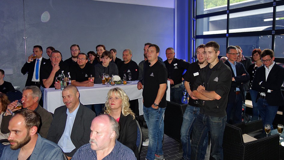von 25: Ein Blick auf die Festgäste. Im vorderen Teil saßen diese auf drei Nutzfahrzeugbühnen, die jeweils 6,5t heben können. Die acht Hebebühnen im hinteren linken und rechten Bereich dienten als Stehtische für das anschließende Catering. Man hat bewusst aus Platzgründen in der neuen Werkstatt auf Kopfarbeitsplätze gesetzt.