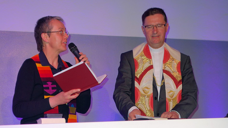 von 25: Pfarrerin Gerhild Ehrmann und der Katholische Dekan Dr. Andreas Krefft segneten die Räume und erbaten Gottes reichen Segen. Dr. Krefft erläuterte das in seiner symbolträchtigen Ansprache, indem er wahrscheinlich mehr unbewusst als bewusst Henry Ford zum V. Evangelisten machte. H. Ford: "Es hängt von dir ab, ob du das Neue Jahr als Bremse oder Motor benutzen wirst!" Oder: "Einer der sich vor der Zukunft fürchtet, beschränkt seine Aktivität!" u.a. Der Dekan sprach weiter von der räumlichen, der geistigen wie von der sozialen Mobilität und sieht im Elektroauto auch einen Beitrag zur Schöpfung. Sein Dank galt auch dem Engagement des Hauses für Afrika-Projekte und an Alexander Klamt für sein besonderes Zeltlagerengagement.