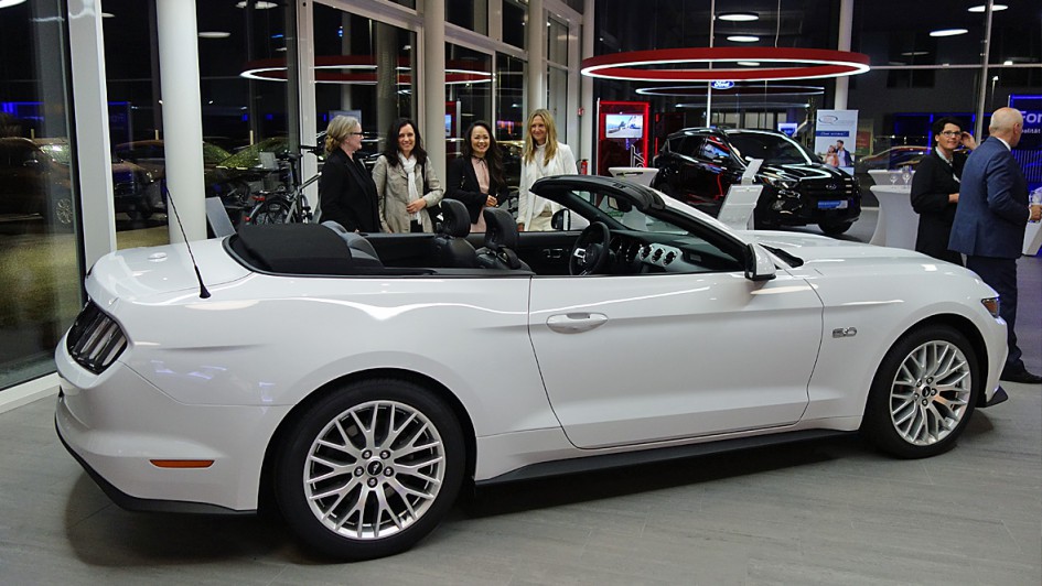 von 25: Da steht er, im neuen Showraum, der Mustang GT, bewundert von einem jugendlichen Damenquartett. Man beachte die Lichteffekte, das Deckendekor des Raumes.