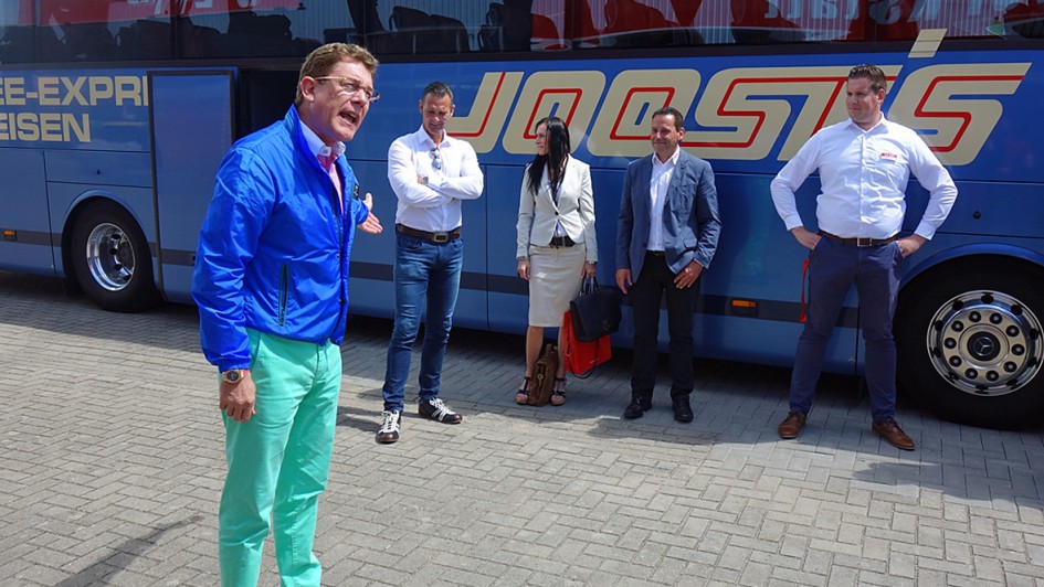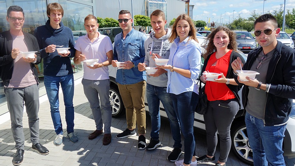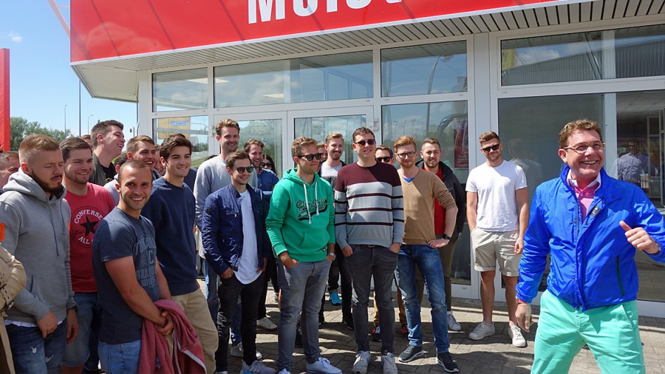 von 22: Firmenchef Wilfried Wilhelm Anclam begrüsste bei Ankunft um 14 Uhr auf dem Firmengelände in Rostock jede Studentin, jeden Studenten per Handschlag. 41 an der Zahl! Mit beim Begrüßungskomitee, sein benachbarten Händlerkollege, Toyota-Händler Stefan Plath, Anclams Assistentin Christina Dorn, Bereichsleiter Daniel Nietzschmann und Verkaufsleiter Steffen Arndt. Anclam liebt und lebt die Top-Organisation. Alles ist minutiös und perfekt vorbereitet. Eben auch der Parkplatz für den großen MB-Bus auf dem Firmengelände.