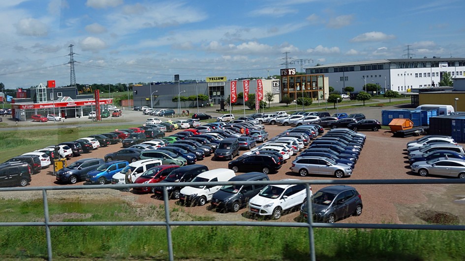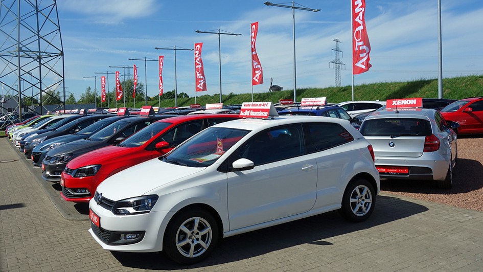von 22: Anclam: "Fahrzeugpräsentation, das muss man können. Der Kunde braucht klare Orientierung." Die Fahrzeuge allesamt gereinigt, markante Auszeichnung, auf Linie ausgerichtet, stimmig optisches Umfeld, markante Fahnenmasten, zehn Meter hoch, saubere Fahnen, Stellfläche ohne Gras- und Unkraut. Anclam: „Wir werden hier in Rostock im Monat zwischen 90 und 100 Fahrzeuge vermarkten. Übrigens haben wir aktuell den dritten Monat hinter uns, indem wir in der gesamten Gruppe jeweils mehr als 2.000 Fahrzeuge verkauft haben.“