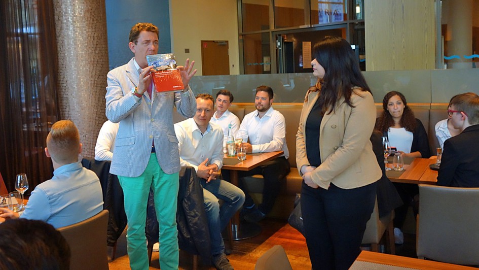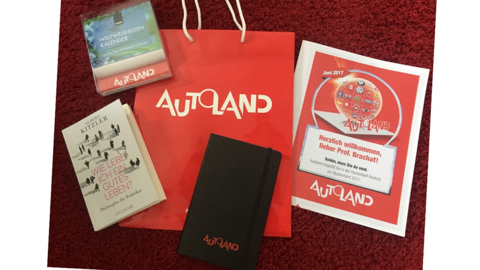 von 22: Nach der Betriebsbesichtung belegten die 41 Studentinnen und Studenten ihr Quartier im 4-Sterne-Hotel Raddison Blue. Anclam: "Das ist mir ein Anliegen. Ich möchte einerseits deutlich machen, dass von nichts nichts kommt. Ich möchte aber auch in jedem Studenten schlafende Fähigkeiten wecken. Noch klarer: Wach musst du sein im Leben!" Jeder der Teilnehmer wurde auf seinem Zimmer mit einer großen Geschenktüte mit individueller Beschriftung überrascht. Darin enthalten der Autoland-Spruchkalender, der jedes Jahr neu erscheint. Das komplette Programm der Veranstaltung, das Autoland-Notebook sowie der Bestseller "Wie lebe ich ein gutes Leben?" von Albert Kitzler. Philosophie für Praktiker. Welch grenzenloser Aufwand! Mit Liebe zum Detail gemacht. Anclams Assistentin, Christina Dorn hat dafür ein besonderes Händchen.