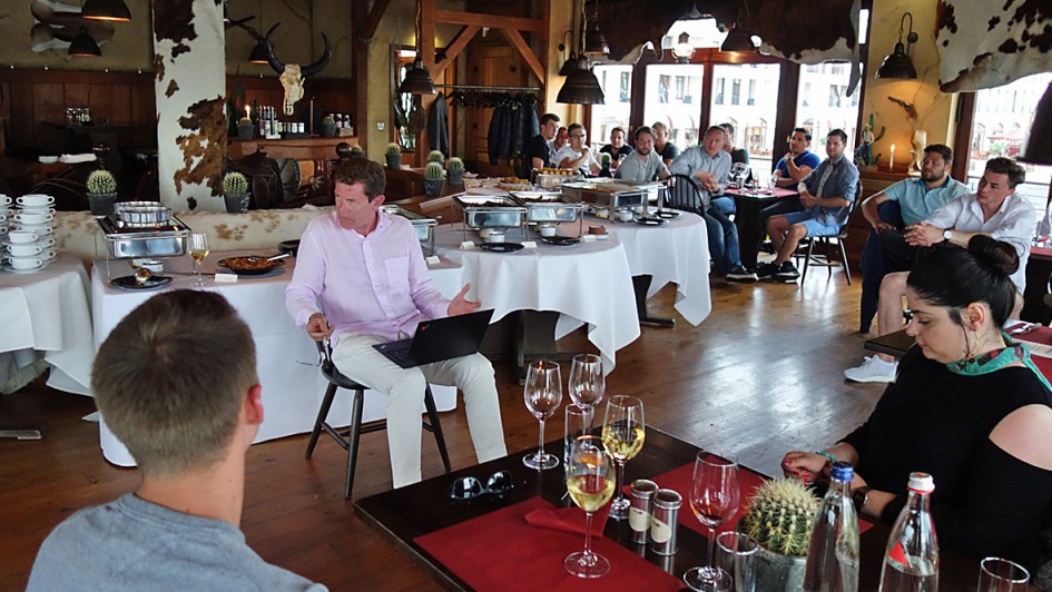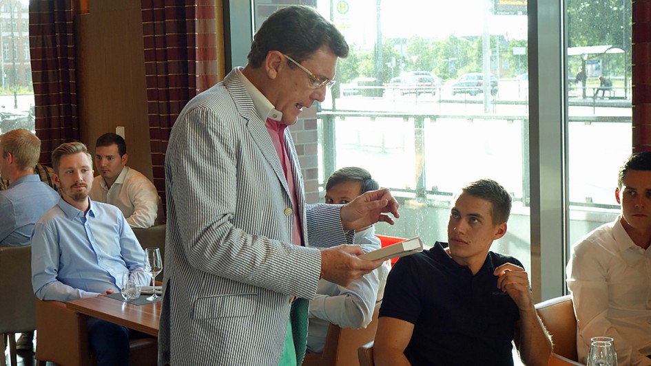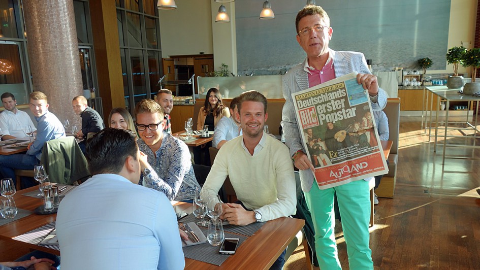 von 22: Was wäre Regisseur Anclam ohne ein fulminantes Finale. Er lud in Warnemünde in das noble Steakhouse ein. Direkt an der Ostsee gelegen. Die Menükarte auf der Folgeseite zeigt die kulinarische Dimension der Ereignisse. Anclam stellte sich einmal mehr den Fragen der Studentenschaft. Dabei stand das Thema Steuerung des Gesamtunternehmens auf der Agenda. Anclam: "Ab 20:30 Uhr liegen mir täglich sämtliche Daten aus den einzelnen Standorten tagesaktuell vor." In welcher Dependance wurden wie viele Einheiten vermarktet? 40 Prozent der insgesamt über 20.000 Einheiten sind inzwischen Neuwagen. 50 Prozent des Ertrages werden über Finanzdienstleistungen erwirtschaftet. Anclam zeigt auf, wie er die Verkäufer am Verkaufserfolg beteiligt. Ein guter Verkäufer verkauft pro Monat 20 Fahrzeuge. Autoland vergibt im Gebrauchtwagengeschäft eine Eigengarantie. Anclam: "Wie verkaufen pro Jahr 10.000 Garantien, Jahresprämie 195 Euro, für zwei Jahre 295 Euro. Dafür haben wir eine eigene Garantiegesellschaft.“ Auf die Frage zum Bereich Diebstahl. Anclam: "Das ist wirklich ein Thema. Wir müssen alle unsere Fahrzeugmärkte einzäunen. Das, obwohl wir 31 Mitarbeiter auf Vollzeit in Sachen Wachschutz beschäftigt haben und weitere 30 auf Teilzeitbasis.“Anclam rief in Folge jeweils die gewünschten tagesaktuellen Kennzahlen live auf. Vom Bruttoertrag pro Fahrzeug, 2.600 Euro, bis zum Krankenstand pro Mitarbeiter und Autohaus. Anclam betreibt inzwischen am Hauptstandort Leipzig/Brehna ein eigenes Hotel. Namen: Bavaria. Anclam: "Wir mussten hier im Rahmen der Flüchtlingskrise aktiv werden. Ich hätte nie gedacht, dass ich sich auch noch Hotelier werde. Wo vor der Übernahme monatlich 20.000 Euro Verlust standen, stehen heute, eineinhalb Jahre später monatlich 30.000 Euro Gewinn. Wir haben innen und außen Geld in die Hand genommen und den Sockel für alle Leistungen qualitativ erneuert. Früher waren da 30 Mitarbeiter beschäftigt. Heute schaffen wir das mit 13. Kostete früher die Übernachtung 57 Euro, so offerieren wir heute die Übernachtung für 48 Euro. Das bringt uns inzwischen 81 Prozent Hotel-Auslastung ein. Die lauere Zeit am Wochenende überbrücken wir mit Busreisenden. Außerdem wird in Kürze die beste Spielhölle Sachsens, die wir zusammen mit unserem Hotel betreiben für Magnetismus am Wochenende sorgen."