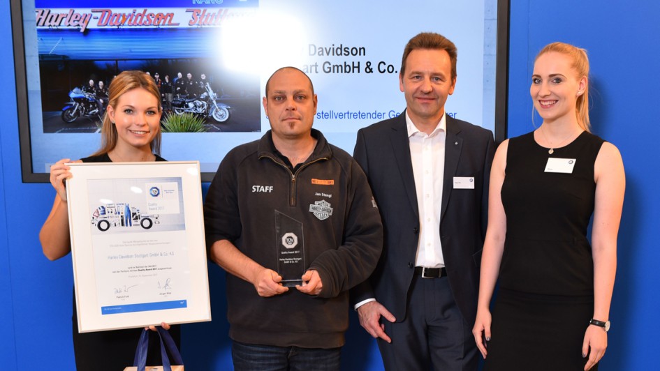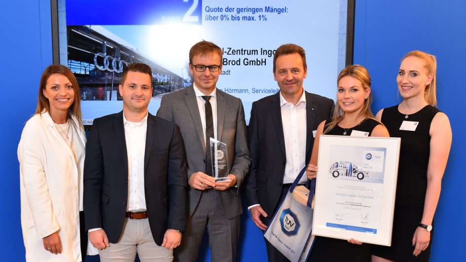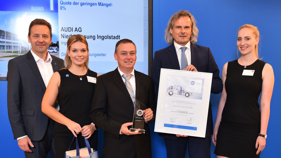 von 4: Gewinner des Awards 2017 (v.l.): Karl-Heinz Bühler (Autohaus Bühler Sweden Car, Platz 1), Jan Stengl (Harley Davidson Stuttgart, Platz 1), Jürgen Hörmann (Audi-Zentrum Ingolstadt Karl Brod GmbH, Platz 2), Dirk Köthe (Audi-Niederlassung Ingolstadt, Platz 1), Jürgen Wolz (TÜV Süd Auto Service)
