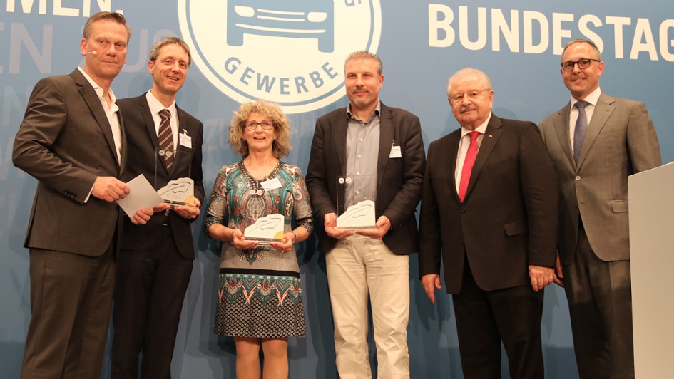 von 15: Die Preisträger des "Blauen Kalligraphen", den Preis für gute Aktionen in der Innungs-Öffentlichkeitsarbeit, mit den Offiziellen (v.l.): ZDK-Vorstand Arne Joswig, Hansjörg Russ (Innung Nürtingen-Kirchheim/Teck), Heidi Baier (Innung Worms), Andreas Jokisch (Innung Ostthüringen) mit ZDK-Präsident Jürgen Karpinski und Fuchs-Vertriebsleiter Dirk Nusselt.