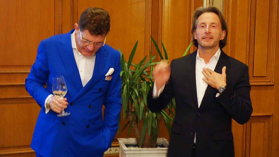 von 15: Wilfried Wilhelm Anclam verstand es, sein Auditorium sage und schreibe viereinhalb Stunden in seinen Bann zu ziehen. Das Kulinarische und das Liquide liefen über diese Zeitspanne mit. Die Marke Autoland ist in den neuen Bundesländern heute mit 22 Standorten vertreten. Anclam plant eine Westöffnung. Sie soll bis 2027 mit 71 virtuellen Standorten entstehen. Dominant in Automeilen. Im Bild re neben Anclam, Jascha Bräuer, Direktor Handelskommunikation Mobilität, der Organisator und Betreuer der "Zukunftsmacher".