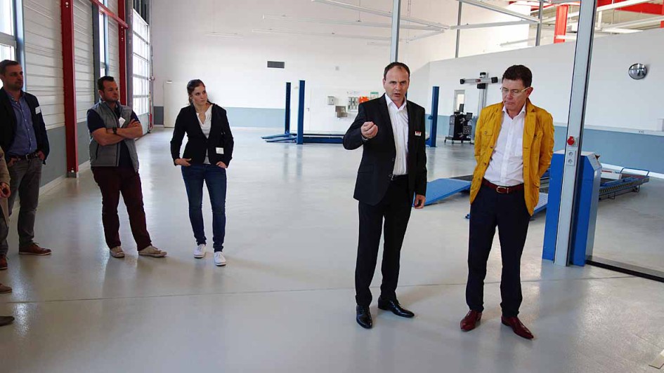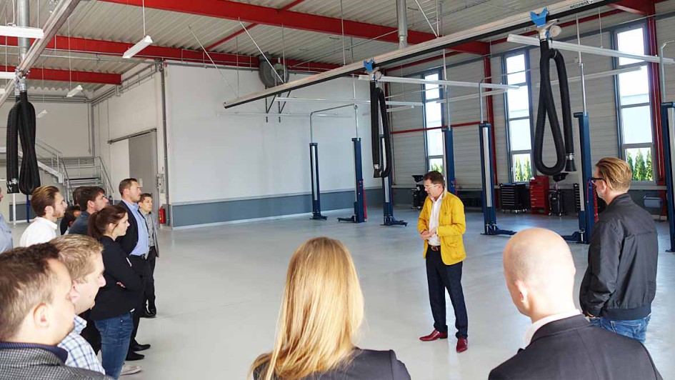 von 15: Hier stellte der Firmenchef den Teilnehmern sein Aufbereitungskonzept vor. Pro Tag sind in der Endstufe 50 Aufbereitungen vorgesehen. Hinter dem gesamten Durchlaufprozess steht die Philosophie, dass Autoland pro Jahr 10.000 Eigengarantien vermarktet und die Fahrzeuge daher in sehr gutem qualitativem Zustand vermarktet werden.