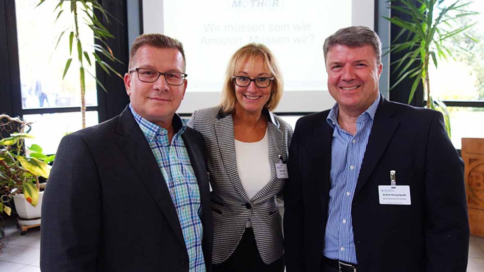 von 19: Frank Motejat, Mehrmarkenhändler in Brandenburg an der Havel und Marketinggenie (l.), faszinierte in seiner besonderen Darstellung der Sicht der Dinge im zweiten Vortrag. Hier im Bild mit Sylvia Gerl und Achim Kreyenpoth, Vertriebsleiter Bank Deutsches Kfz-Gewerbe, der für den BFC-Förderverein teilnahm.