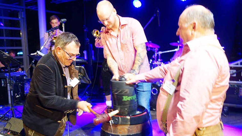 von 19: Dietmar Neubauer, Vertriebsleiter von Veedol, stiftete das Bier für den Abend und setzte den Spund mit zwei Schlägen im Bierfass fest. Seine Losung: "Ich trinke auf dein Wohl: Veedol!"