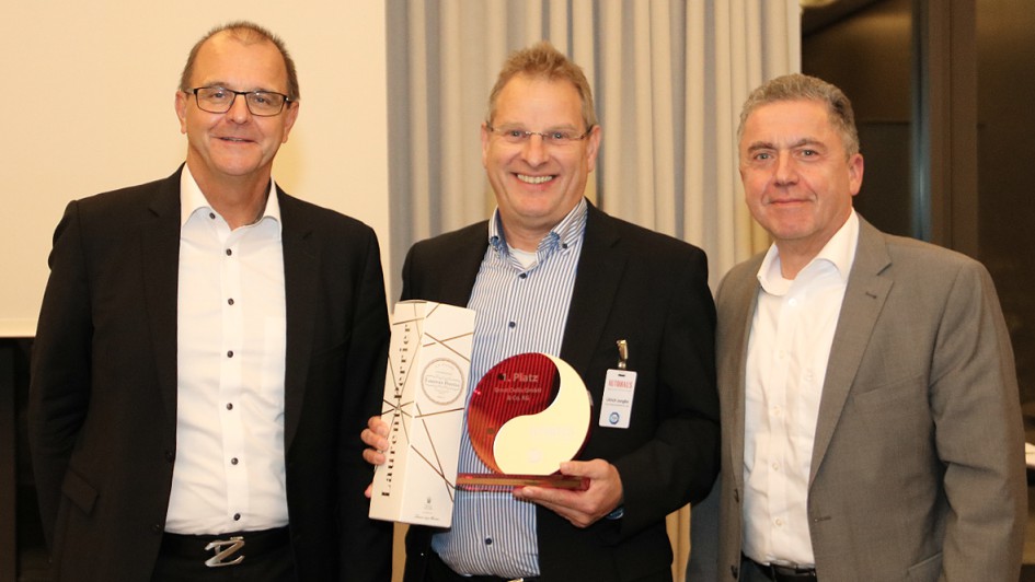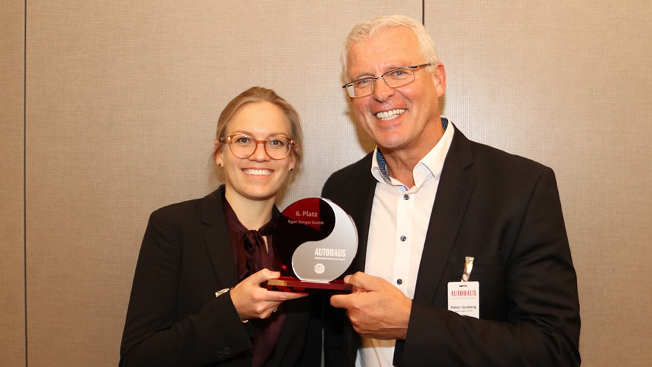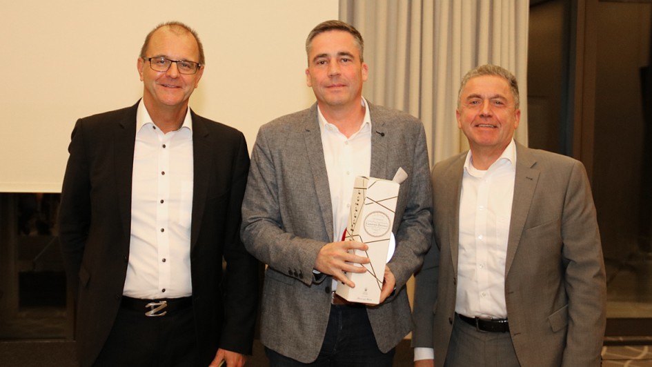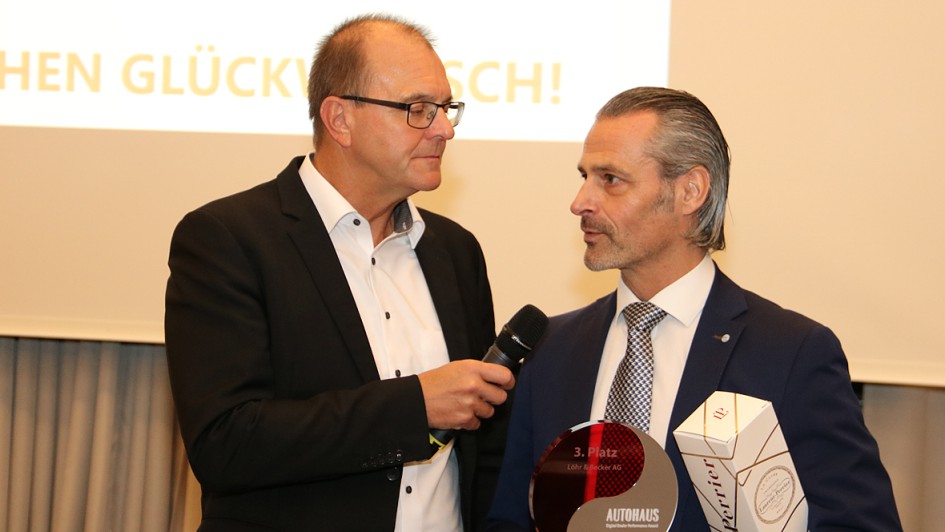 von 14: Platz 1. Dello. Ulrich Jungke (m.): "Der Award hat uns positiv überrascht. Als Erfolgsrezept sehen wir die langjährige Pflege unserer Marke und die hohe Kontinuität im Unternehmen. In den digitalen Auftritt investieren wir circa 20 Prozent unseres Marketingbudgets." Links im Bild AUTOHAUS-Chefredakteur Ralph M. Meunzel, rechts Kurt Deppert, Vertriebsleiter Division Auto Service und Leiter Business Development bei TÜV Süd.