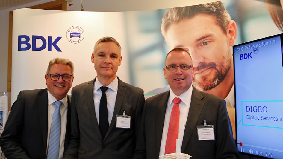 von 23: Digitalisierungsspezialist Werner Popp, Vertriebsleiter Kooperationen Torsten Stoer und der Regionalleiter Süd Christoph Mertens (v.l.) von der Bank Deutsches Kfz-Gewerbe (BDK) informierten am Stand.