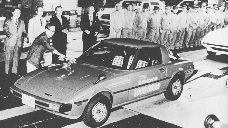 von 10: Schon kurz nach Serienanlauf des RX-7 legte er alle japanische Zurückhaltung ab und ließ anlässlich einer Million Wankelmotoren medienwirksam die Champagnerkorken knallen.