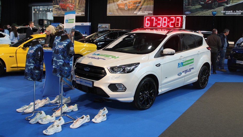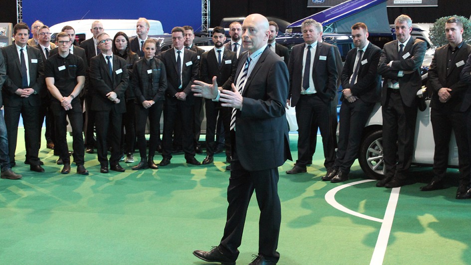 von 16: Am Vortag der Messen werden die 60 Akteure auf dem Messestand von Ford Ernst & König professionell durch Eberhard Gross, Messe-Coach aus Fulda "eingenordet". Raymond Damerow, der Direktor Verkauf der Ford Werke, ist live dabei und nimmt von jedem Verkäufer dessen Zielsetzung entgegen. So entsteht das Messe-Soll. Im letzten Jahr wurden sage und schreibe 186 Neuwagen vermarktet. Die Latte für die 33. Automobil 2018 wurde in der Zielgröße auf 200 Einheiten gelegt. Im Bild: Raymond Damerow li., Messetrainer Eberhard Gross, Firmenchef Siegfried Ernst. Mit in der Motivationsrunde Fritz Keller, Präsident des SC Freiburg und VDP-Winzer in Oberbergen, Kaiserstuhl, ein Top-Manager sowie die Geschäftsführer Martin Ernst und Peter König. Die Macher!