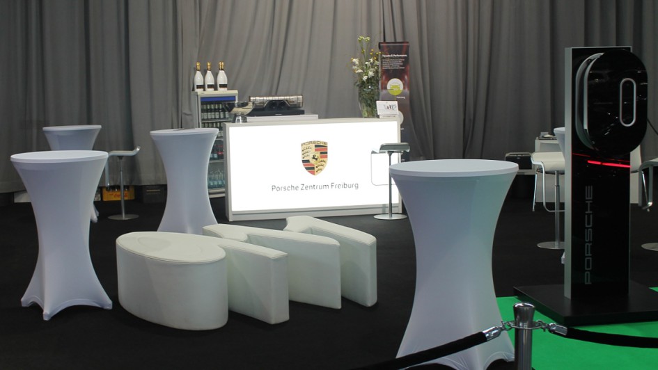 von 16: Die Kooperation zum SC wird nicht nur über die "Turnschlappen" dokumentiert. Auch die Uhr tickt. Die Restlaufzeit der Messe. Die Uhr kann man verstellen, die Zeit nicht.