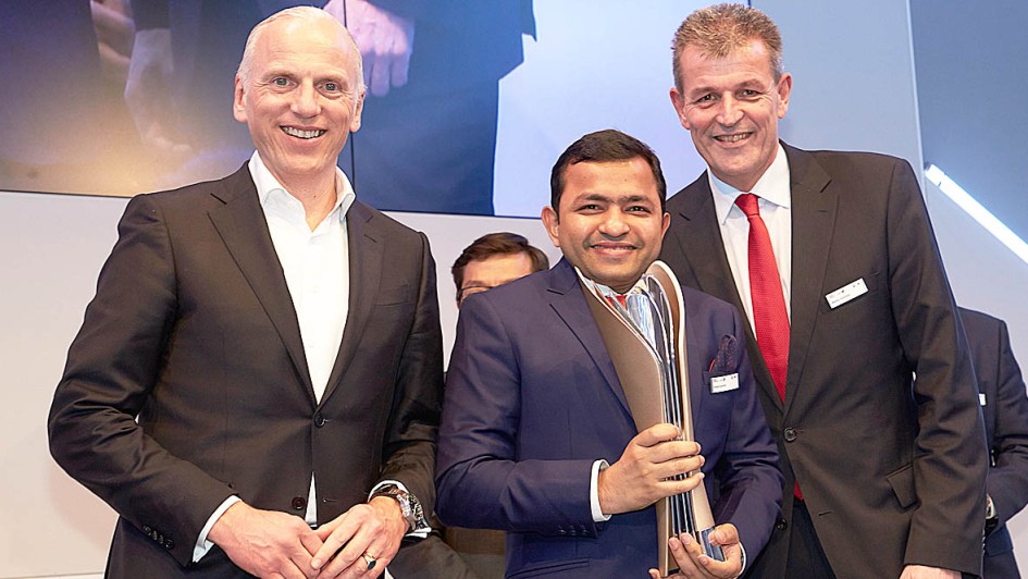 von 9: Pieter Nota, Mitglied des Vorstands der BMW AG, Vertrieb und Marke BMW, Aftersales BMW Group (links) übergab gemeinsam mit Dr. Markus Schramm, Leiter Konzernplanung und Produktstrategie (rechts), den Preis in der Kategorie "Bester Händler in Nachhaltigkeit" an Bavaria Motors, Indien.