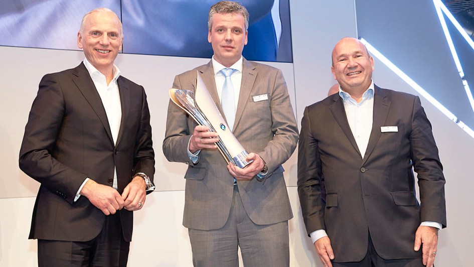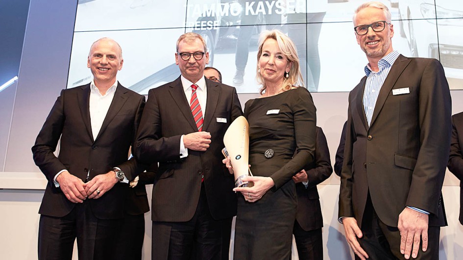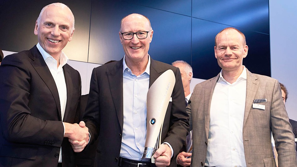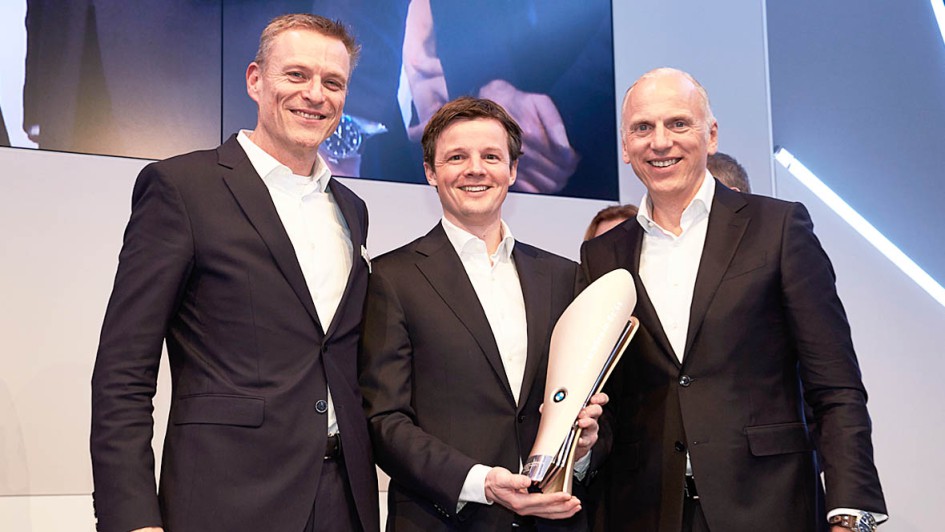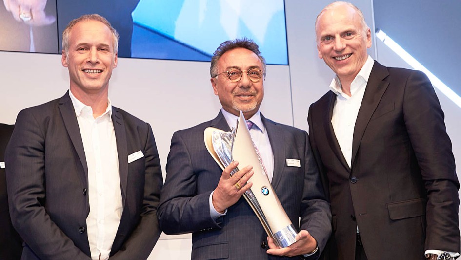 von 9: Pieter Nota, Mitglied des Vorstands der BMW AG, Vertrieb und Marke BMW, Aftersales BMW Group (links) übergab gemeinsam mit Bernd Doepke, Leiter Qualitätsmanagement Kunde (rechts), den Preis in der Kategorie "Kundenbetreuung" an Freese, Deutschland.