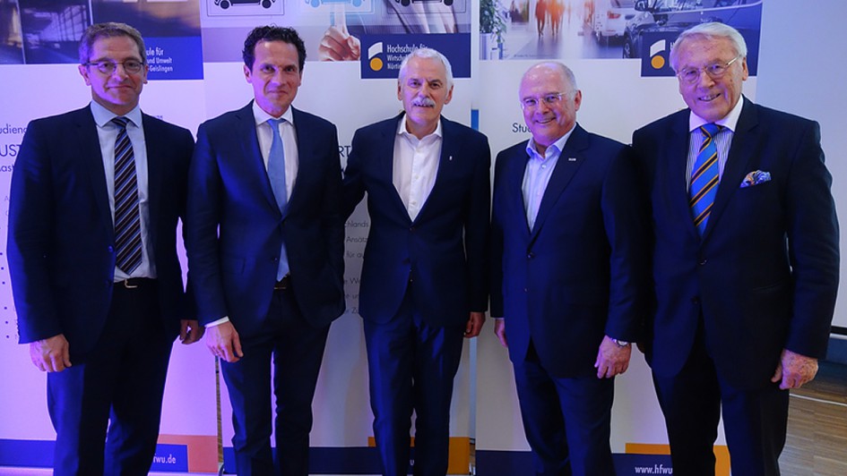 von 27: Ein Blick in das hochkarätig besetzte Forum. Hier der "linke Flügel". In der ersten Reihe: Prof. Andreas Frey, der Rektor der Hochschule für Wirtschaft und Umwelt Nürtingen-Geislingen (r.), Nicole Hoffmeister-Kraut, Ministerin für Wirtschaft, Arbeit und Wohnungsbau Land Baden-Württemberg, Dieter Zetsche, Prof. Willi Diez, Marlies Diez, Prof. Werner Ziegler, Rektor em., Laudator, und Prof. Valentin Schackmann, Prorektor.