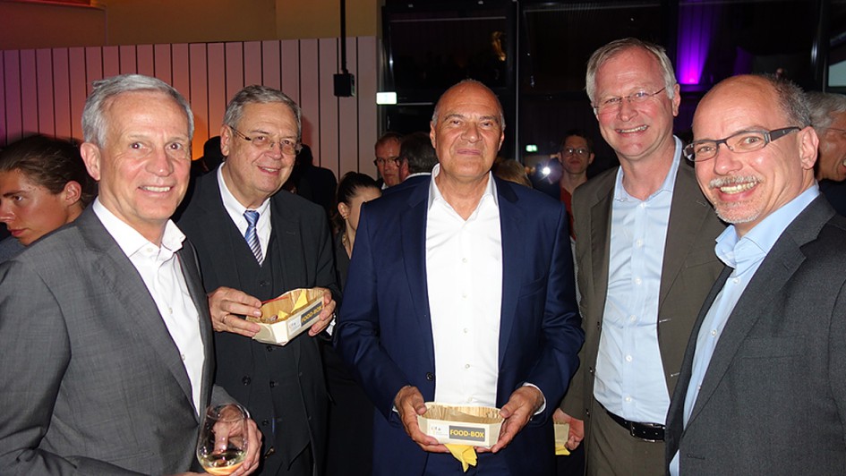 von 27: Lutz Kortlüke, Vorstandsvorsitzender RealGarant (l.) Peter Reisacher, GF BMW Reisacher und BMW-Händlerverbandspräsident, Prof. Diez, Jürgen Tauscher, Vorstandsvorsitzender Fahrzeugwerke Lueg AG, und "Sir" Kurt Kröger, Gesch. Gesellschafter Dello.