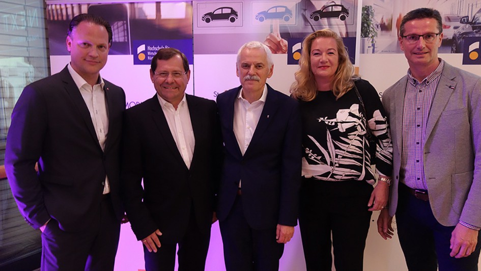 von 27: Vor Beginn der Veranstaltung traf man sich im freien Foyer der Hochschule. Im Bild: Gregory Hancke, stellv. Vorsitzender des Vorstands Mosolf (COO), ehemaliger Präsident der AUTOMOBILIA, Lorenz Leuchtenberger, ehemaliger Absolvent und Geschäftsführer der BMW-Stadac, Jörg Mosolf, Vorsitzender des Vorstands, Wolfgang Göbel, Mitglied des Vorstands, Till und Erwin Koller.