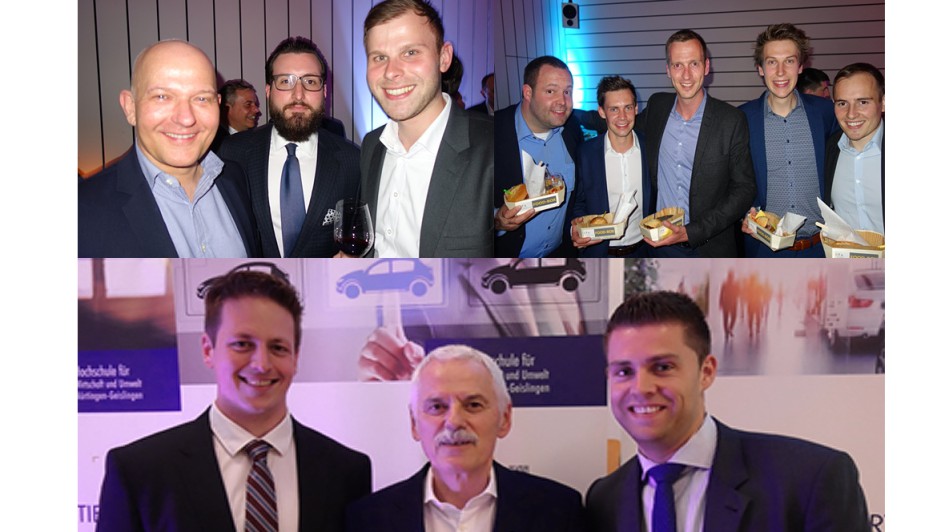 Bild u.: Marc Eschen, Vorstand von Cars ac e.V.(r) und Peter Albers, Bereich HR mit Prof. Diez. / Bild re.: Prämierter Masterabsolvent zu Geislingen Paul Krull, (mi) heute BMW mit aktuellen Masterstudenten.