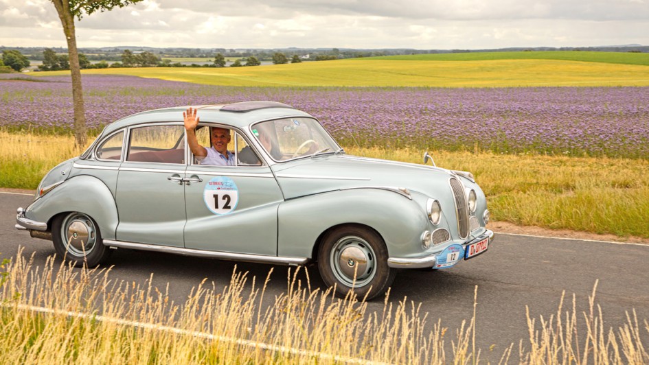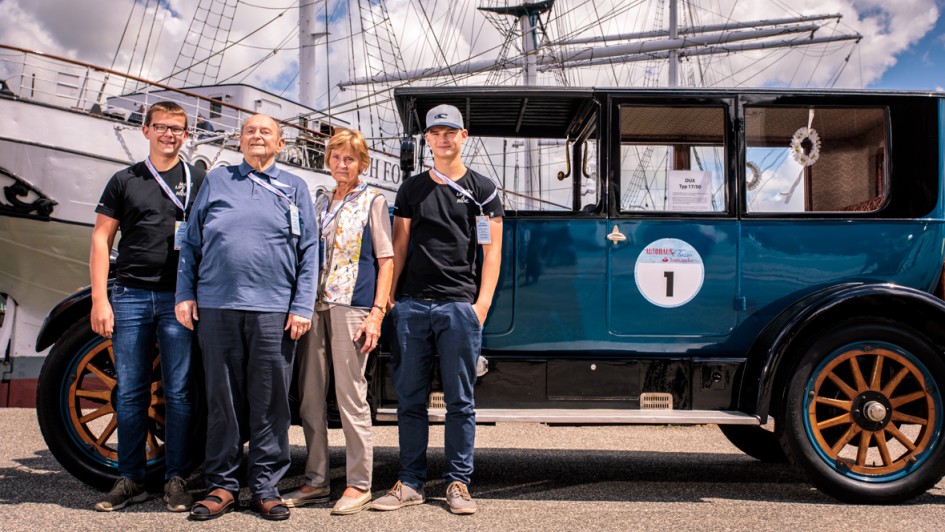von 20: Zwei Generationen, ein Team: das Ehepaar Rolf und Erika Müller vom Autohaus Müller Leipzig mit seinen Enkeln Franz und Paul. Das Gefährt: ein DUX Typ S 17/50.