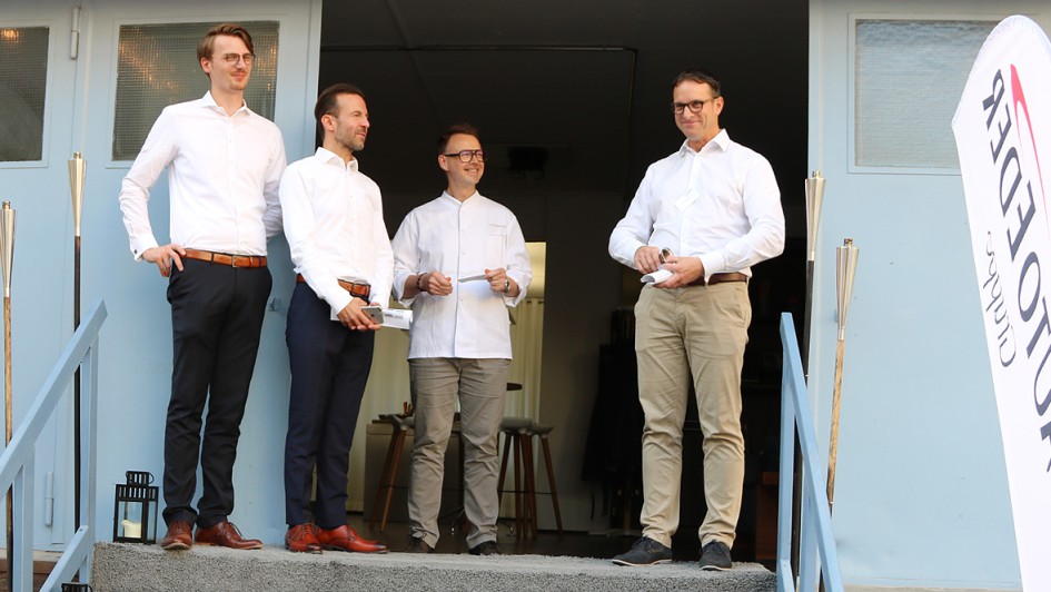 von 3: Kurze Begrüßung (v.r.n.l.).: Christian Schneider, Geschäftsführer des Flottenleistungszentrums der Eder-Gruppe, Starkoch Holger Stromberg, Moritz Bayer, Großkundenberater für Jaguar und Land Rover im FLZ Eder und Patrick Wagner-Geis, Key Account Manager Fleet&Business bei Jaguar Land Rover Deutschland.