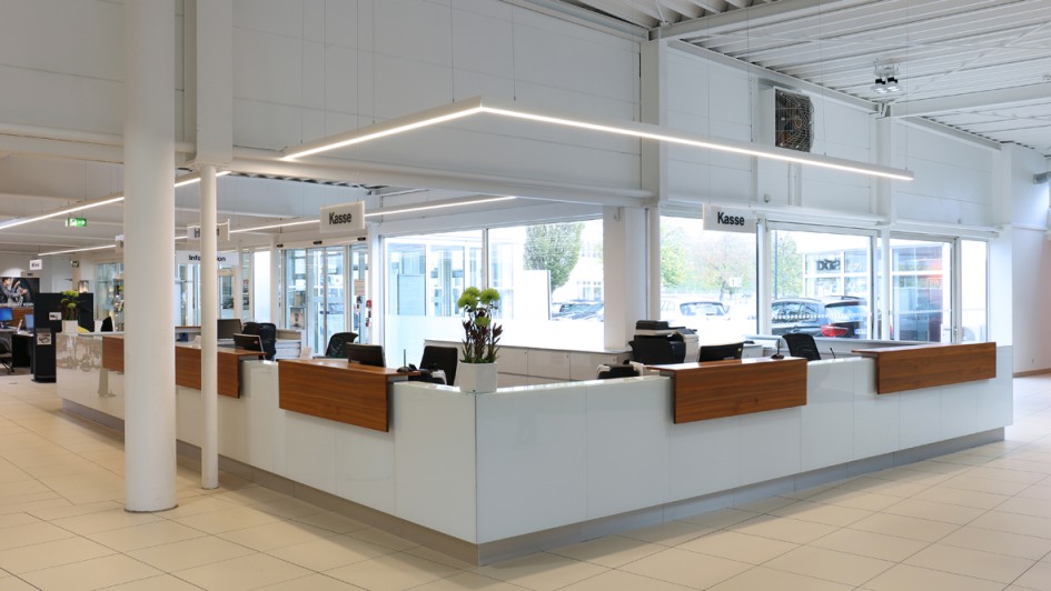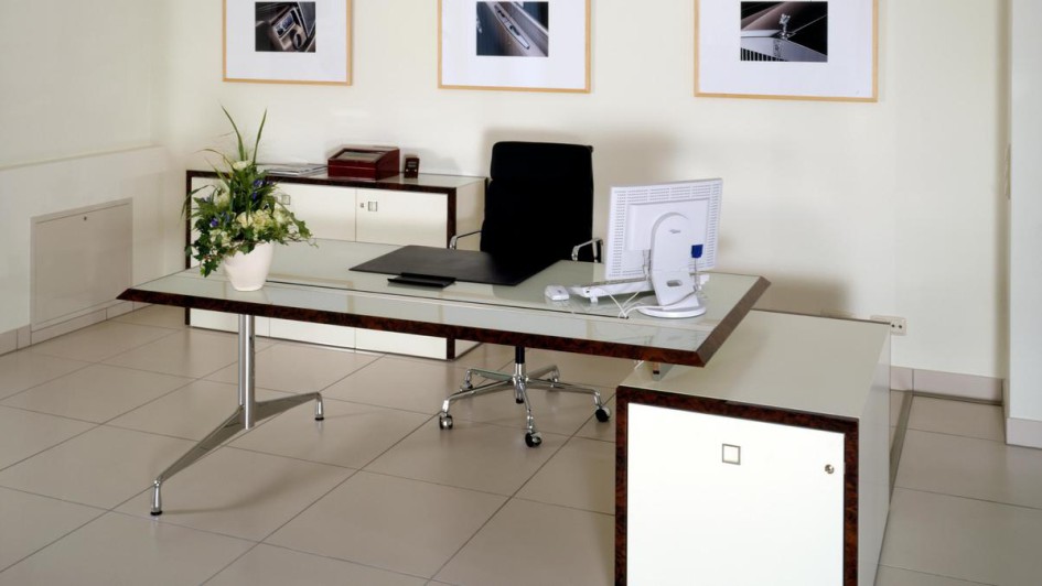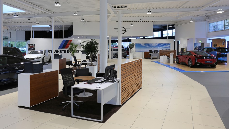 von 12: Anfang 2011 entwickelten BMW und Dula die Basis für das heutige "EPoS"-Konzept. Hochwertige Materialien wie Mineralwerkstoff kombiniert mit lackierten Nussbaumhölzern auf Teppichen oder Parkett sollen für eine warme Atmosphäre mit hohem Wohlfühlcharakter bei Kunden und Mitarbeitern sorgen.