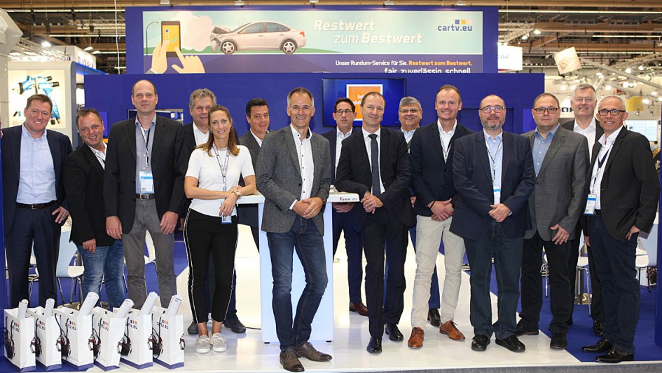 von 33: Frequentierte Restwertbörse (v.l.): Standgast, Kai Ganz, Carsten Prinz, Thomas Rürup und Simona Vrabcova (alle cartv), Nils Rathsmann (Enterprise), Thorsten Böhm (cartv), Olivier Wohlfahrt (Control€xpert), Alexander Backhaus (Enterprise), Thomas Lein (AXA), Wojciech Wesoly und Lothar Rabeneik (beide cartv), Joachim Steinetz (WGV), Thorsten Fiedler (Eurogarant) und Jochen Kohlmann (cartv).