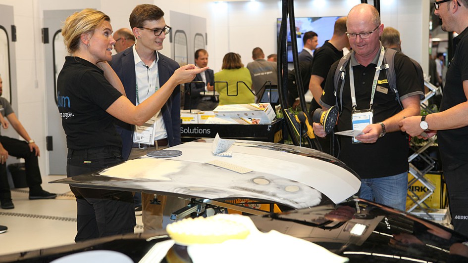 von 33: SEHON präsentierte als Weltneuheit den SE-Application-Manager. Mit dieser Anlage können Betriebe und Lackhersteller bei schnell härtenden Lacken vollständig auf Trocknungsenergie verzichten und Härtungszeiten um bis zu 50 Prozent reduzieren. Im Bild (v.l.) zu sehen: Hans Jobst (Technikberater), Ingo Heyde (Sales Manager), Standgast, Jens Wurster (TL), zwei Standgäste, Stefanie Sehon (kfm. Leitung), Marcel Müller (Sales Manager), GF Tiemo Sehon, Andreas Tank (Technik/Vertrieb), Annett Popp (Marketing), Standgast, Sergej Seifert (Leiter Konstruktion) und ein weiterer Interessent.