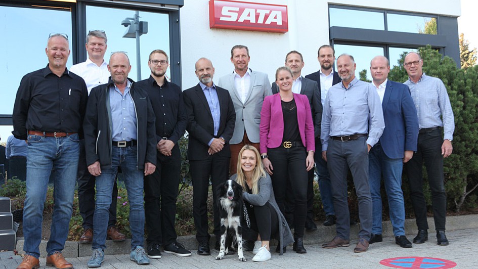 Beim letzten Treffen vor Potsdam waren viele, die es zeitlich einrichten konnten, nochmals zu Gast bei SATA in Kornwestheim (v.l.): Ralph-Peter Döring (Mirka), Sebastian Scholz (SATA), Siegbert Müller (Carbon), Moritz Feller und Matthew Whittall (beide Innovation Group), Tiemo Sehon (SEHON), Bianca Leffelsend (Spies Hecker/Axalta), Marcel Müller (SEHON), Patrick Neumann (AUTOHAUS), Heiko Leicht (Horn & Bauer), Ralf Rathmann (Carbon) und Ullrich Bechmann (Innovation Group). Vorne in der Mitte: Petra Bindl (Moderatorin der Live-Reparatur) mit Redaktionshund Milo.
