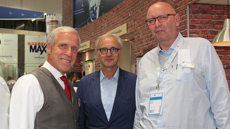 von 33: SATA-Geschäftsführer Albrecht Kruse (l.) mit Hubert Haberbusch (Master of Art Restaurator von Sammlungsfahrzeugen) und Jürgen Book (r.) von Glasurit Classic Cars.