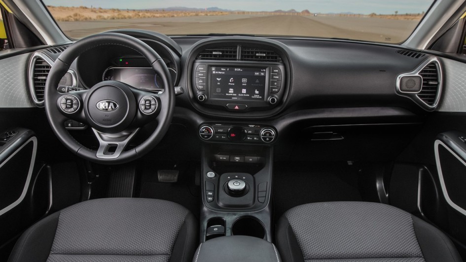 von 14: Der Innenraum des e-Soul präsentiert sich aufgeräumt. Hebel für die Feststellbremse oder das Getriebe gibt es nicht mehr. Ersteres ersetzt ein kleiner Hebelschalter in der Mittelkonsole, statt eines Schalthebels gibt es einen kleinen Gangwahl-Drehschalter.